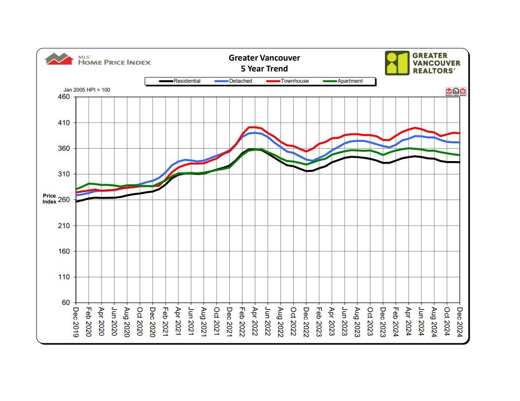 The MLS® Home Price Index composite benchmark price for all residential properties in Metro Vancouver is currently $1,171,500. This represents a 0.5 per cent increase over December 2023 and a 0.1 per cent decrease compared to November 2024.